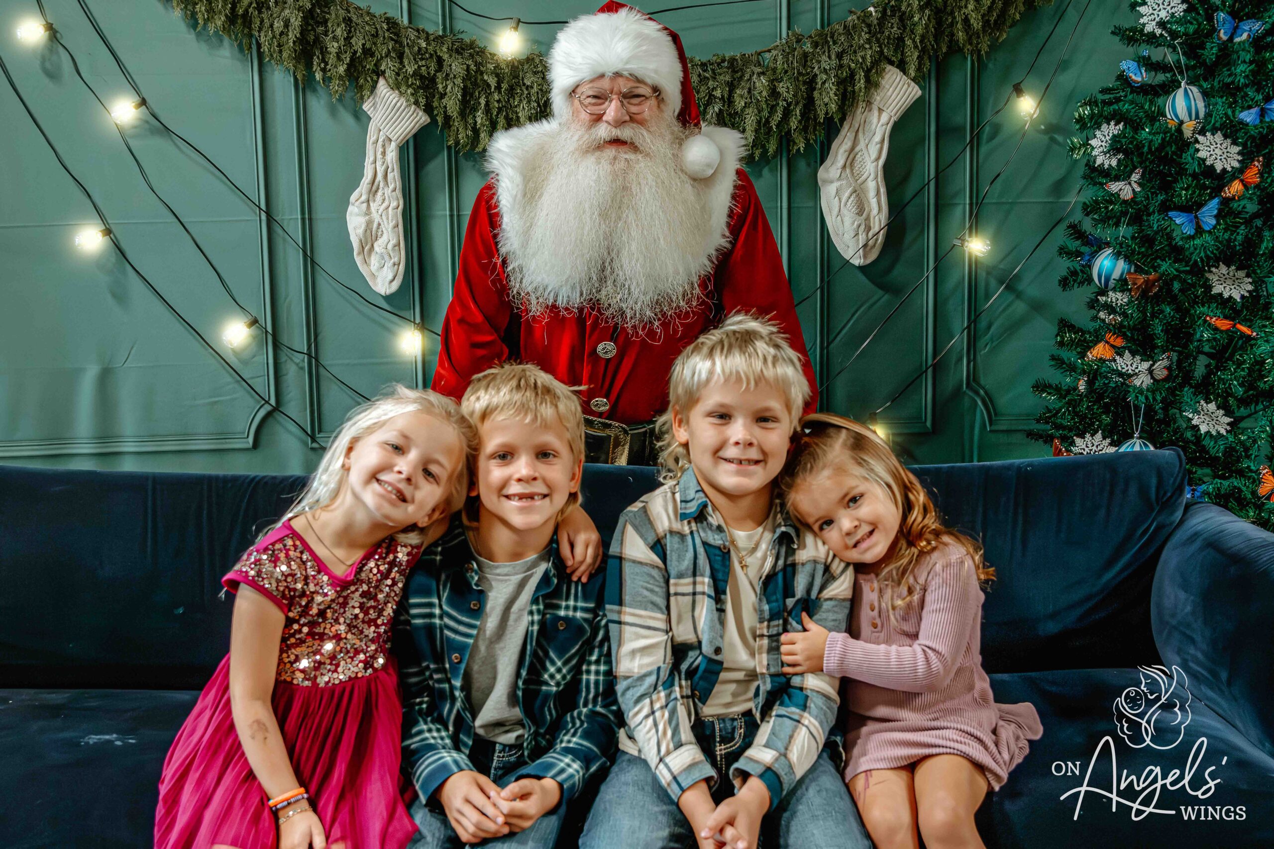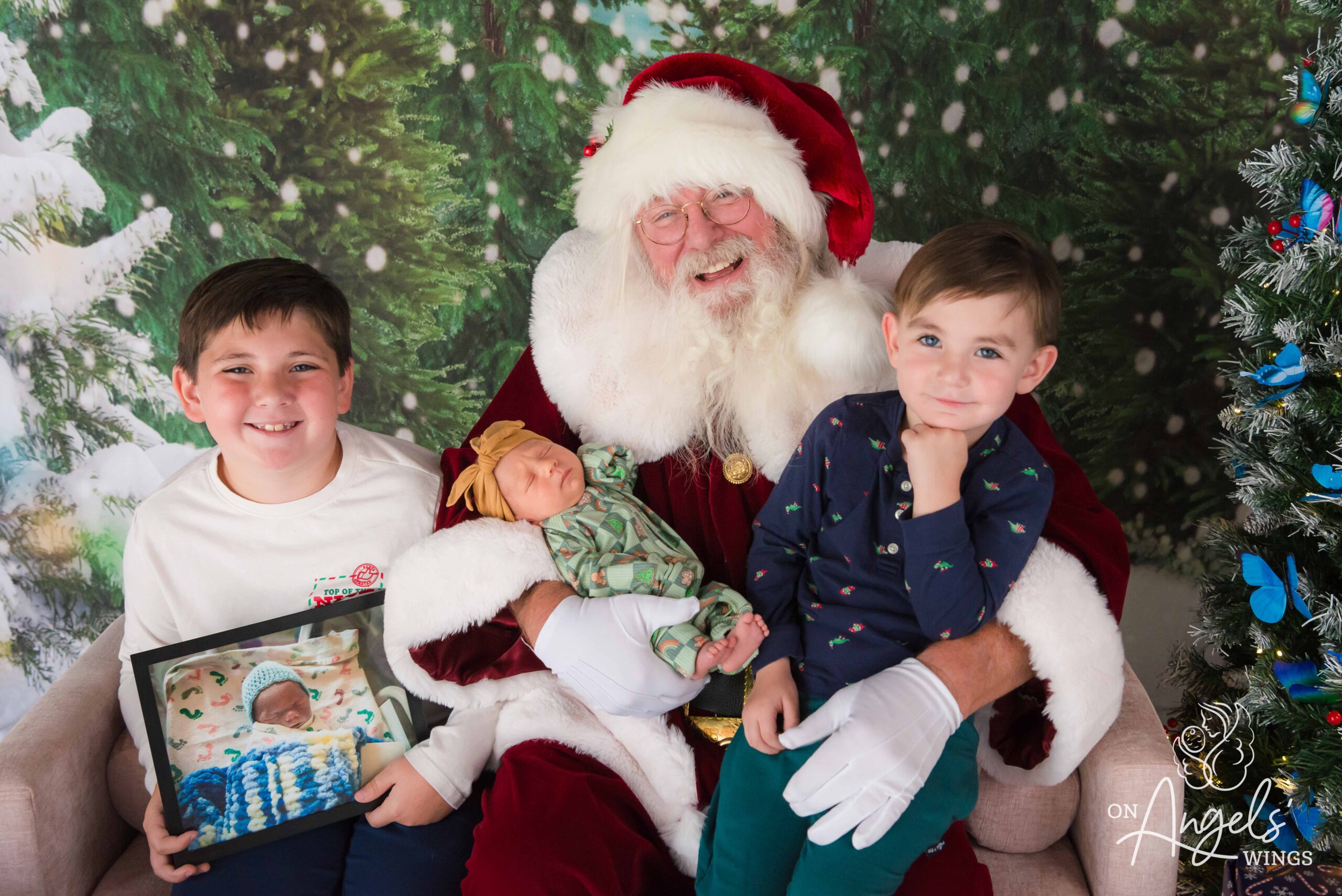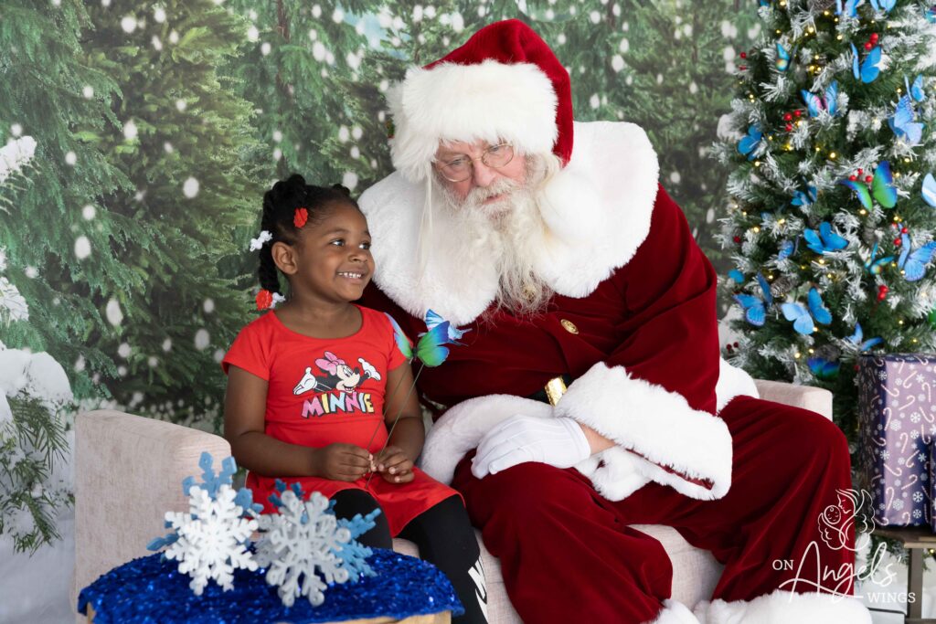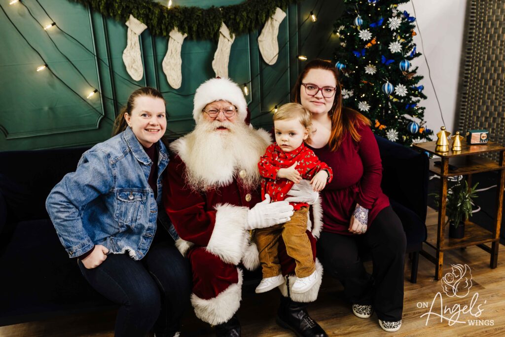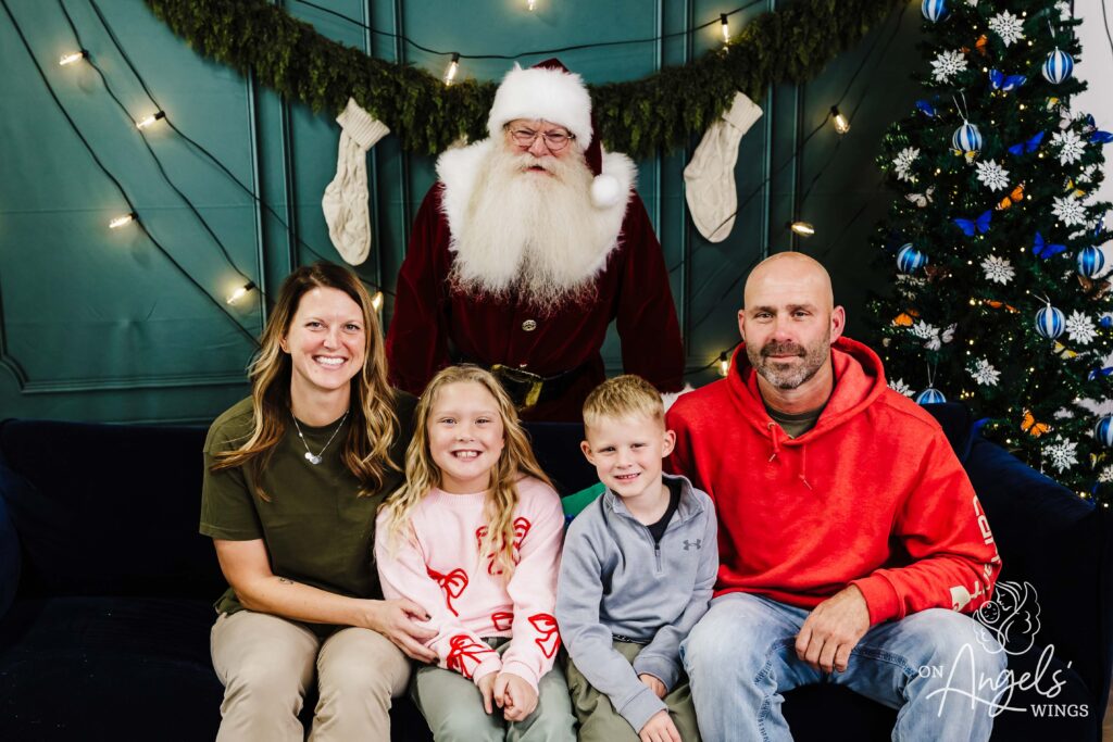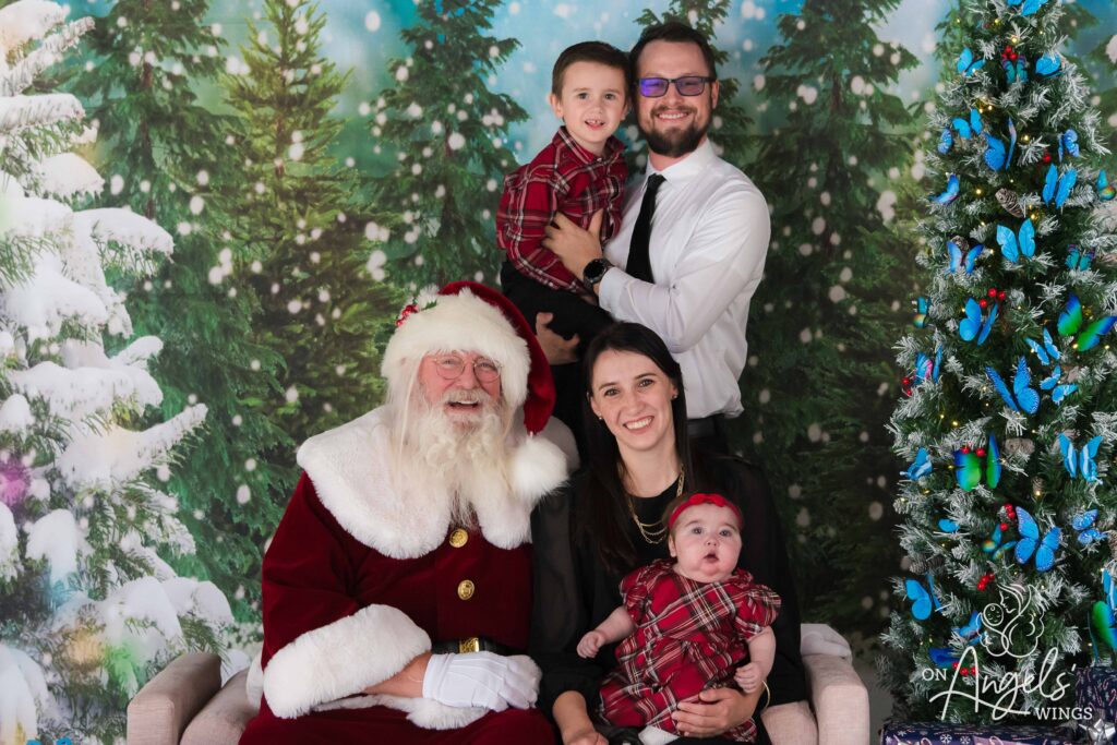 This year, OAW added butterfly ornaments to the Christmas trees in Springfield and St. Louis, a symbolic touch meant to honor children lost and those still courageously fighting. While subtle, the addition became a meaningful element for families—especially those who used the session to include a photo of a child who is no longer living. Springfield loss recipient Jessie Masterson shared how much that mattered to her. “Our children who are no longer living can also be included by using a photo of them to be photographed with Santa during the session. In this environment the photographers and staff understand loss. We were treated so kindly and the volunteer photographer was so patient.”
