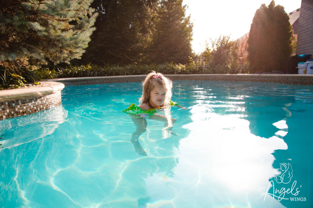 And then there was the time we did pictures in her great-grandmother’s backyard, one of her favorite places in the world. At first, Ellie wasn’t having it. She knew she’d get to swim eventually and couldn’t understand why we were delaying that. She needed more bandaids—her emotional weather gauge. But eventually, she started jumping and dancing. And once she was in the pool, the pure joy on her face brought me to tears all over again.